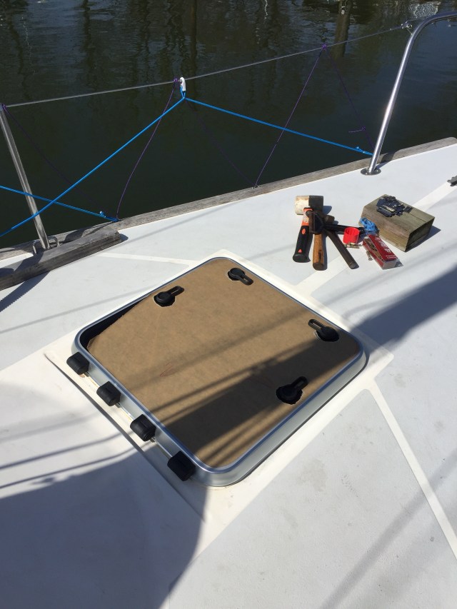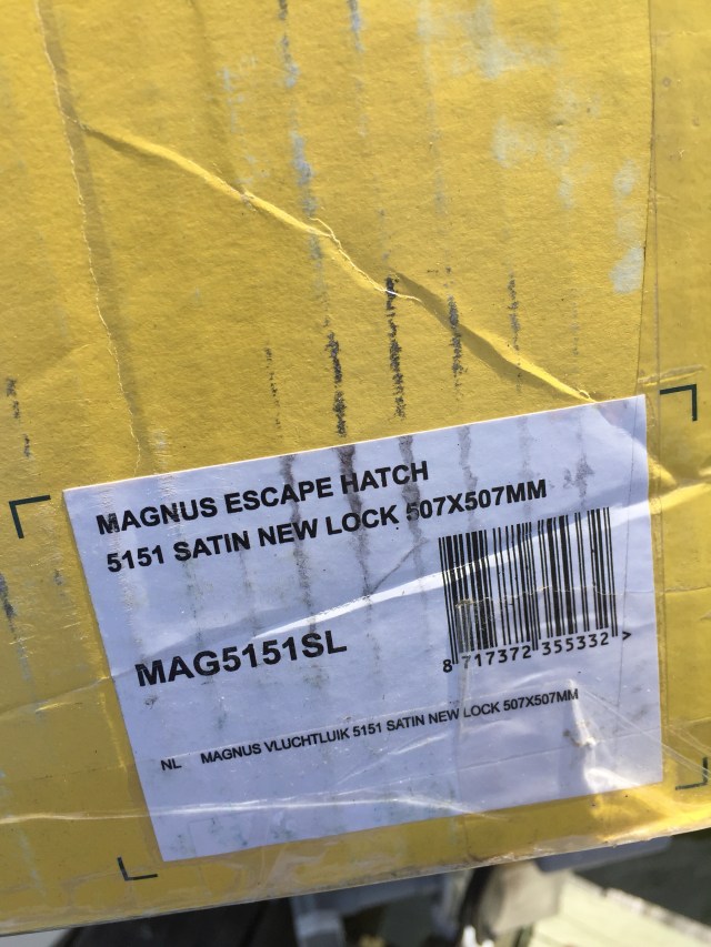 Different bolt pattern but fits perfectly and cost half the price of the Lewmar Hatch at Defender Spring Sale.
