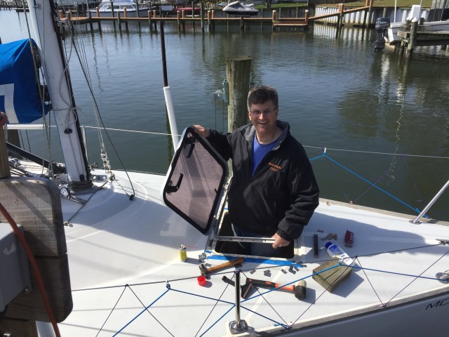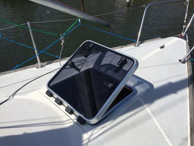 Different bolt pattern but fits perfectly and cost half the price of the Lewmar Hatch at Defender Spring Sale.
